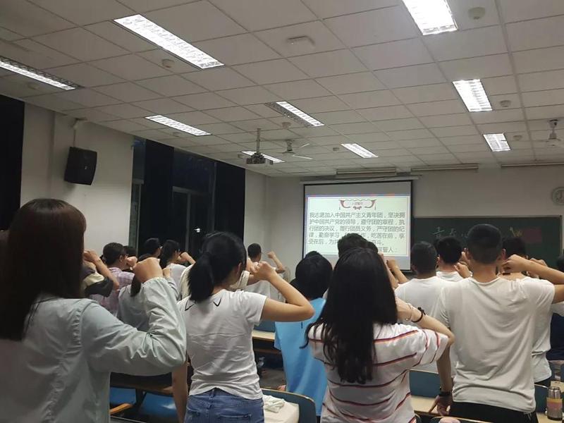 在庄严肃穆的国歌声中,团日活动拉开了序幕。国歌奏毕,全体团员在17级团支书李桐的带领下,面对鲜红的团旗庄严宣誓,重温入团誓词,铿锵有力的宣誓声中饱含着同学们对祖国的无限热爱。