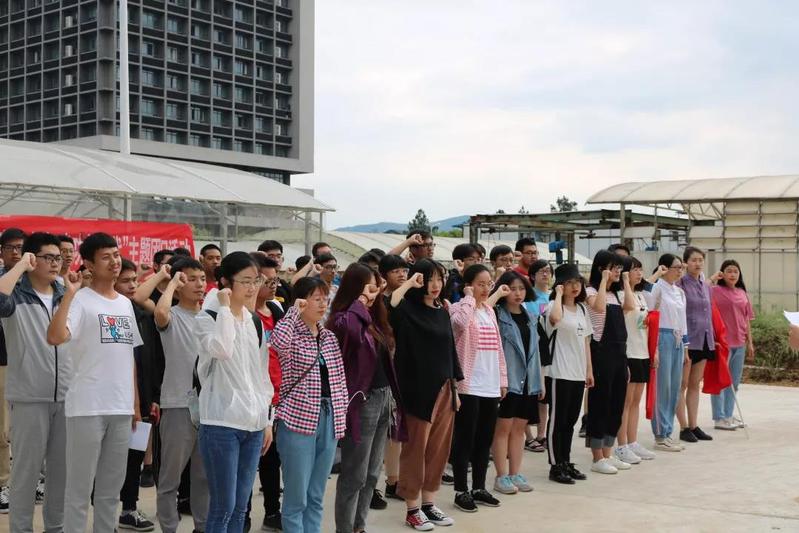 活动开始,所有同学肃静立正,齐唱国歌。随后,17级优秀团员代表于洋同学围绕在新时代继承和弘扬五四精神,向大家进行团旗下的演讲,号召同学们争做新时代的新青年,树立远大理想,脚踏实地,砥砺前行。接下来,在18级优秀团员代表韦琦同学的带领下,所有同学齐唱团歌,并重温入团誓词。
