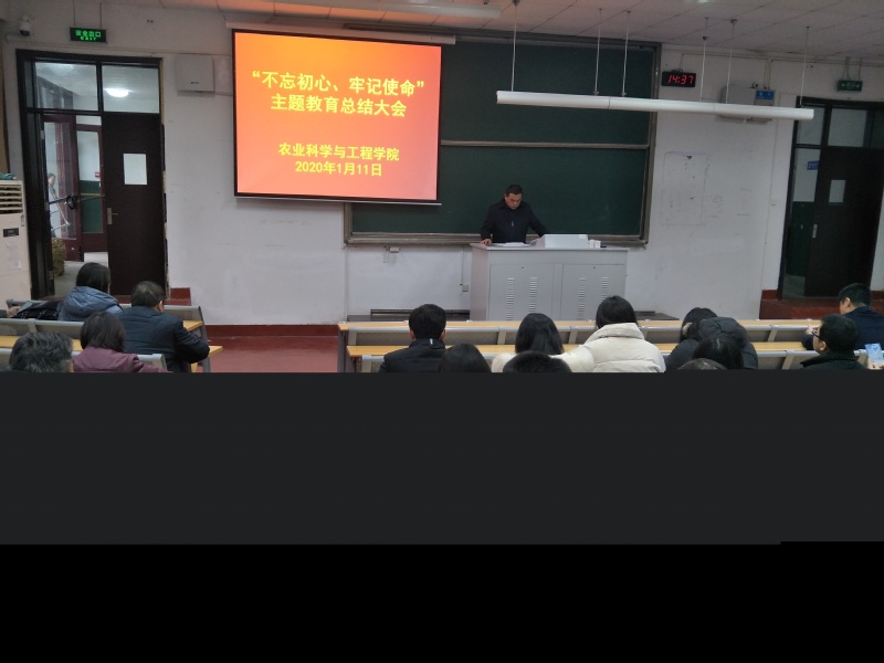 1月11日下午2:30我院在水利馆101召开“不忘初心、牢记使命”主题教育总结大会。此次会议贯彻落实习近平总书记在“不忘初心、牢记使命”主题教育总结大会上的重要讲话精神,贯彻落实教育部直属高校主题教育总结大会精神,贯彻落实我校主题教育工作的具体安排,全面总结学院开展“不忘初心、牢记使命”主题教育的具体工作和主要成效,并安排部署进一步巩固和深化主题教育成果的工作重点。会议由院党委书记陈毓陵主持,并作总结报告。研工部李枫部长、党委巡查办公室秘书刘峰老师出席了此次会议,并有全院教职工及学生党员参加。