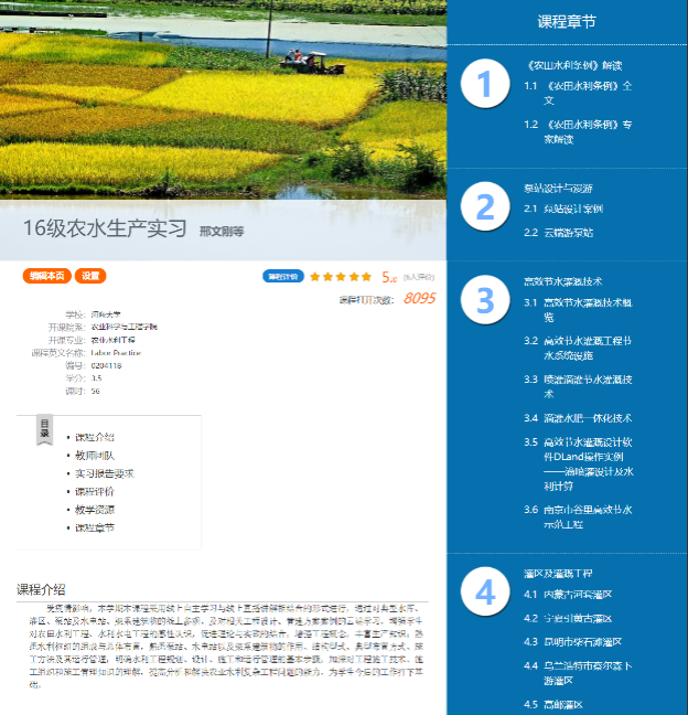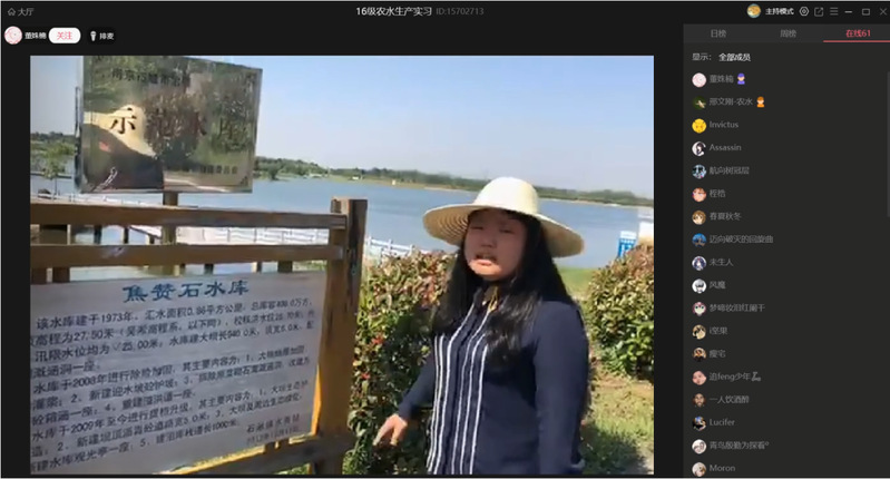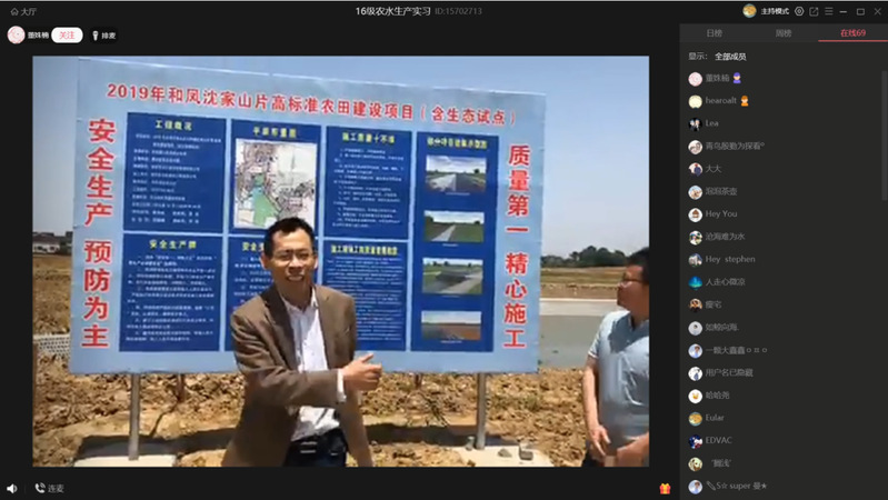 本次线上实习直播教学内容包括和凤镇高标准农田建设工程、和凤镇塘坝清淤工程、环山河水利工程、章西圩排涝泵站工程、大新塘河道整治工程、方便灌区河道整治工程、三堡排涝工程、浙江省灌溉试验中心站-江东农水试验基地、铜山源水库灌区等。实习教师亲赴实习现场,以网络连通千里,用摄影镜头带领学子身临工程实景。线上直播,实习教师变身网红主播,连线大咖,工程专家成为特邀嘉宾,通过现场讲解工程的建设目的、建设内容、设计方案、施工情况、建设现状、管护措施、预期成效等内容,生动地介绍了实际工程案例和施工经验教训,讲授了工程建设过程中应用到的新理念、新技术,并在线解答同学们提出的问题,带来一场场内容充实、形式新颖的生产实习直播课程。