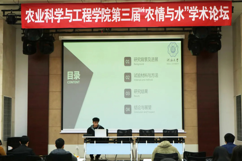 江赜伟同学介绍了稻田水碳管理模式及其对气候变化的适应性调整研究,阐述了不同水碳调控下DNDC模型的验证和改进,并通过不同水文年水碳管理对稻田SOC及水稻生长、产量的影响,优选水碳联合管理模式,条理清晰、重点突出,获得了评委老师的高度评价。