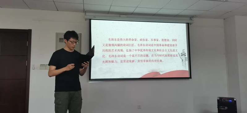活动以历史时间为线索,由11个党员小组依次上台就各自所选诗词的创作背景、历史故事、诗词赏析、体悟感想等诸多方面展开了详尽的介绍与展示。各组介绍方式各有特色,有声情并茂的情景展示,有娓娓道来的故事叙述,亦有激情昂扬的诵读表演,形式多样,取得了良好的效果。