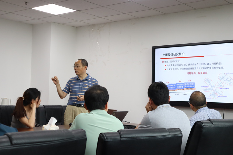 史志华教授主要从事土壤侵蚀机理、景观格局与生态过程等方面的研究和教学工作。在报告会上,史志华教授针对社会经济因素对水土流失作用复杂且多层次、水土流失治理效果依赖于农户行为和意愿等问题,详细阐述了四个关键研究领域,分别是(1)水土流失治理需求的时空变化规律。史教授阐述了人为因素在水土流失治理中的可控性,从而构建反映水土流失治理需求评价指标,识别影响治理效果的社会经济因子,为寻求合理的水土流失治理途径提供了依据。(2)农户社会网络对水土流失治理的影响。史教授首先介绍了农户社会网络的构成,接而通过对比农户社会新型网络与传统网络的异同之处,强调了网络特征、关键节点对水土流失治理的影响。(3)流域社会经济发展对水土流失的驱动。通过对人为和自然因素下流域径流泥沙的演变机制进行分析,史教授剖析了流域水土流失变化的主要驱动力,发现经济发展、农业投入有利于控制水土流失。农业产出的增长加剧水土流失。(4)农产品远程消费对水土流失的影响。分析了供应链与耕地水土流失的关系,发现远程消费需求对耕地水土流失的影响显著;从国家以及全球尺度,发现隐含水土流失都是从不发达地区向发达地区转移,为水土流失治理提供新的视角。