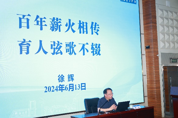 徐辉教授的报告从历史回顾和人才培养两方面展开。在历史回顾部分,徐辉教授通过对“老河海”、“华水”、“新河海”三个时期的深度介绍,带领老师同学们共同回顾了河海大学百余年的辉煌办学历史。河海大学因水而生、缘水而为、顺水而长,有着深厚的历史积淀、光荣的红色校史。从河海工程专门学校到华东水利学院,再到今天的河海大学,学校始终与国家同呼吸、与民族共命运,学校建设发展始终与党的历史紧密相连。在不同阶段的时代背景下,一批批河海人艰苦创业、砥砺奋进、坚韧不拔,以“兴学育才、治水兴邦”为己任,践行着“治水救国”“治水报国”“治水强国”的历史使命。