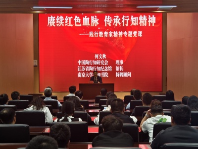 何文秋馆长给参加活动的教师上了题为《赓续红色血脉,传承行知精神》的践行教育家精神专题党课。他从南京的四张城市教育名片说起,希望老师们通过了解南京城东中山陵、城南雨花台、城西南京大屠杀遇难同胞纪念馆、城北陶行知纪念馆的教育意义,在课堂上向学生传播正面、积极、向上、红色的力量。馆长饱含深情、极富感染力地讲述了晓庄十英烈的故事,感人肺腑,让大家感受到了红色晓庄的革命历史以及晓庄英烈们崇高浪漫的革命理想。何馆长生动讲述了陶行知先生的生平事迹,让全体教师深切感受陶行知先生“爱满天下”、“教学做合一”的教育理念。